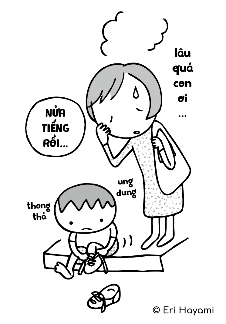 ![]() | Bình thường ta thay quần áo trong vài phút, xỏ tất hết vài giây, buộc giây dày cũng chỉ trong vài lần nháy mắt. Vì chúng ta là người lớn mà. Trẻ con chậm chạp là bởi chúng là trẻ con. Các con chưa thể điều khiển ngón tay một cách linh hoạt nên không thể thay quần áo nhanh nhẹn được. Và chúng vẫn còn đang luyện tập để làm được tốt hơn thôi. Dây thần kinh vận động thật ra phát triển chạm hơn chúng ta nghĩ khá nhiều đấy. Khi các ngón tay cử động chậm rãi thì sẽ dễ trở nên khéo léo hơn. Hãy nghĩ rằng việc con chậm chạp chính là để luyện tập để sau này có thể làm mọi thứ nhanh nhẹn hơn, |