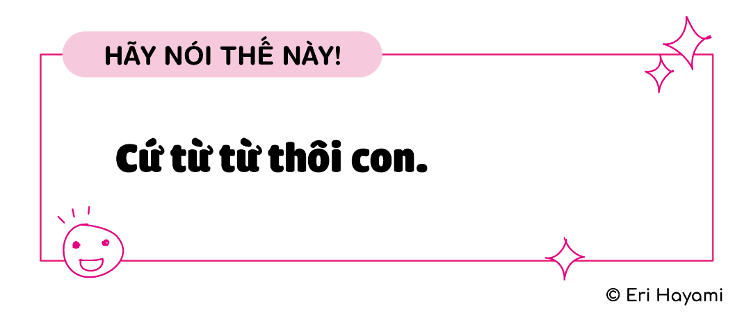 Cũng có khi ta cố tình nói ngược với con là "Con cứ từ từ thôi", thì con lại nhanh nhẹn hơn. Chính câu nói "từ từ thôi" của mẹ cho thấy chúng ta đang kiên nhẫn đợi con, và con có thể hành động mà không bị áp lực đấy.