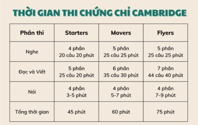Thời gian thi từng kỹ năng của mỗi cấp độ bố mẹ xem trong bảng dưới đây: