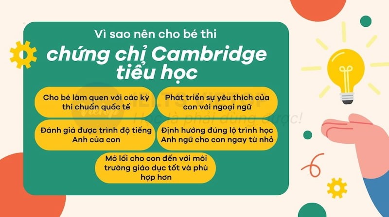 Chứng chỉ Cambridge Tiểu học là một bằng cấp quốc tế uy tín được cấp bởi Đại học Cambridge, Vương quốc Anh, nhằm đánh giá toàn diện năng lực tiếng Anh của học sinh tiểu học từ 5 đến 12 tuổi. Chứng chỉ này hiện được công nhận rộng rãi và ngày càng trở thành một yêu cầu quan trọng trong quá trình tuyển sinh vào các chương trình giáo dục song ngữ hoặc tăng cường tiếng Anh tại Việt Nam.