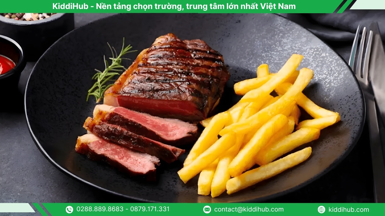 Bò bít tết luôn là lựa chọn không thể thiếu trên bàn tiệc, mang đến trải nghiệm ẩm thực vừa quen thuộc vừa sang trọng. Thịt bò mềm ngọt tự nhiên, tùy theo sở thích, bạn có thể chọn mức độ chín từ tái đến chín vừa. Kết hợp cùng măng tây, khoai tây nghiền, hay thêm trứng ốp la và xúc xích, món ăn trở nên trọn vẹn và đầy hương vị.
