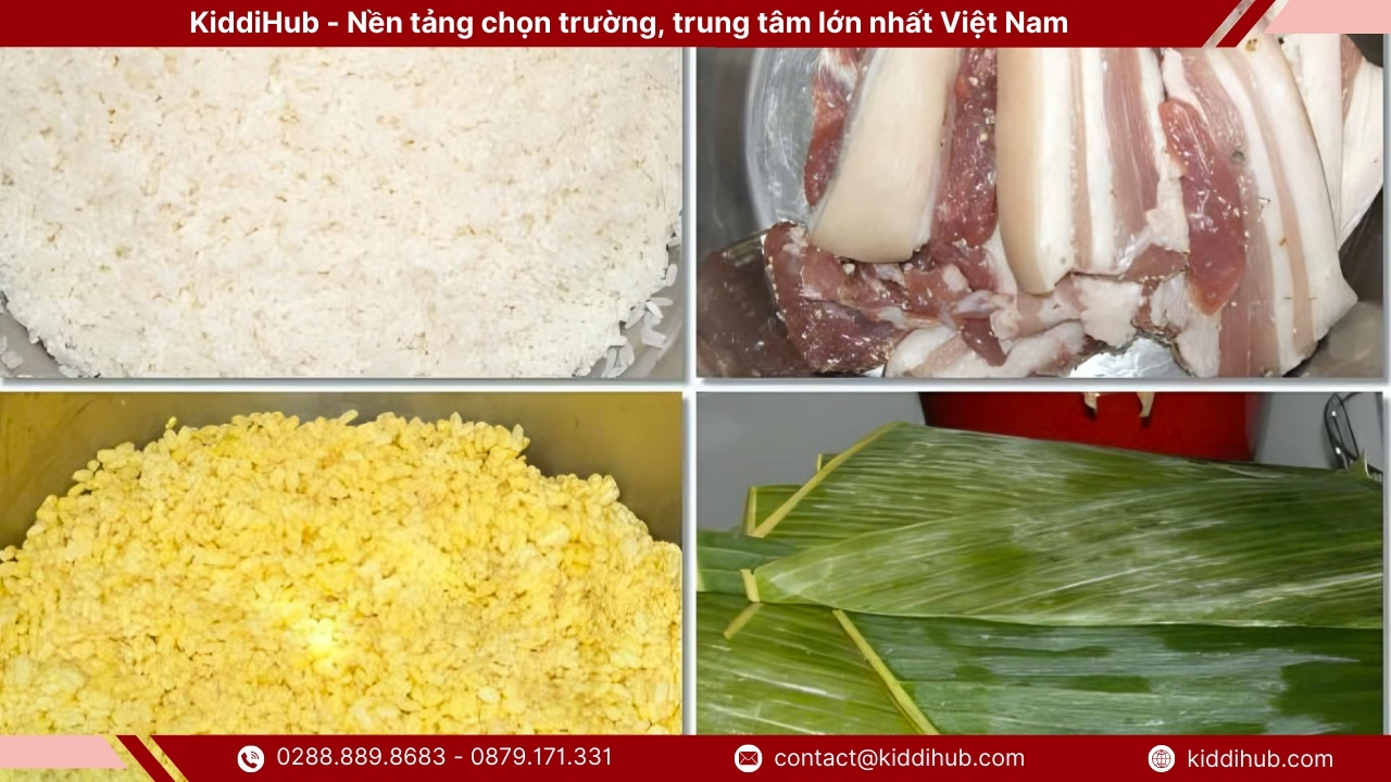 Nếu muốn tự tay gói một chiếc bánh chưng vuông vức, bạn cần chuẩn bị đầy đủ các nguyên liệu quen thuộc như gạo nếp, đậu xanh, thịt mỡ, lá dong và dây lạt. Quá trình gói bánh đòi hỏi sự tỉ mỉ ở từng công đoạn, từ cách xếp lá cho ngay ngắn đến việc buộc lạt chắc tay để bánh giữ được form đẹp.