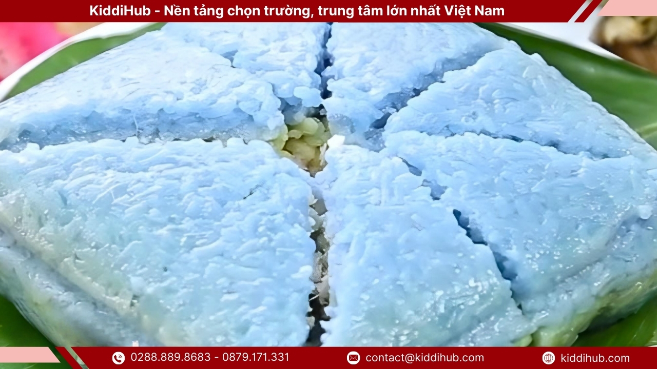 Bánh chưng hoa đậu biếc là phiên bản biến tấu hiện đại từ bánh chưng truyền thống, gây ấn tượng với lớp nếp có sắc xanh nhẹ nhàng chiết xuất từ hoa đậu biếc. Gam màu thanh mát này không chỉ giúp chiếc bánh thêm độc đáo mà còn mang lại cảm giác tươi mới, phù hợp với không khí rộn ràng của ngày Tết.