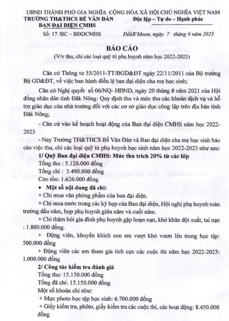Báo cáo thu chi quỹ phụ huynh là văn bản ghi chép toàn bộ các khoản thu vào và chi ra từ nguồn quỹ phụ huynh của một lớp học hoặc nhà trường trong một thời gian nhất định.