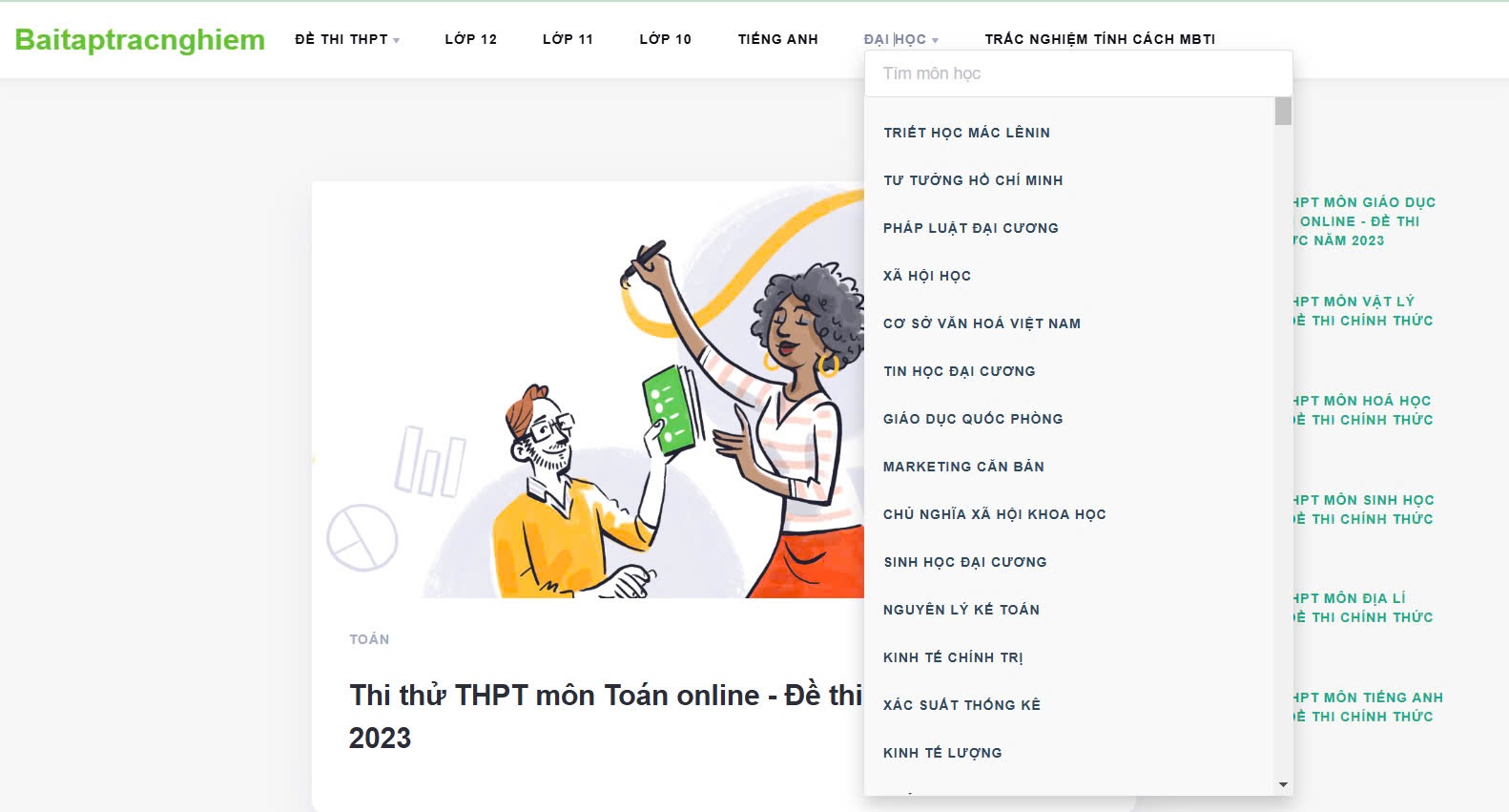 Website này cung cấp hàng ngàn bài tập trắc nghiệm với đủ các môn học đại cương, từ các môn khoa học tự nhiên, xã hội cho đến các môn cơ bản về lý thuyết. Điều đặc biệt là bạn có thể luyện tập trực tuyến ngay trên máy tính hoặc điện thoại mà không cần cài đặt phần mềm. Đây là một công cụ rất tiện lợi, giúp bạn ôn luyện bất cứ lúc nào.