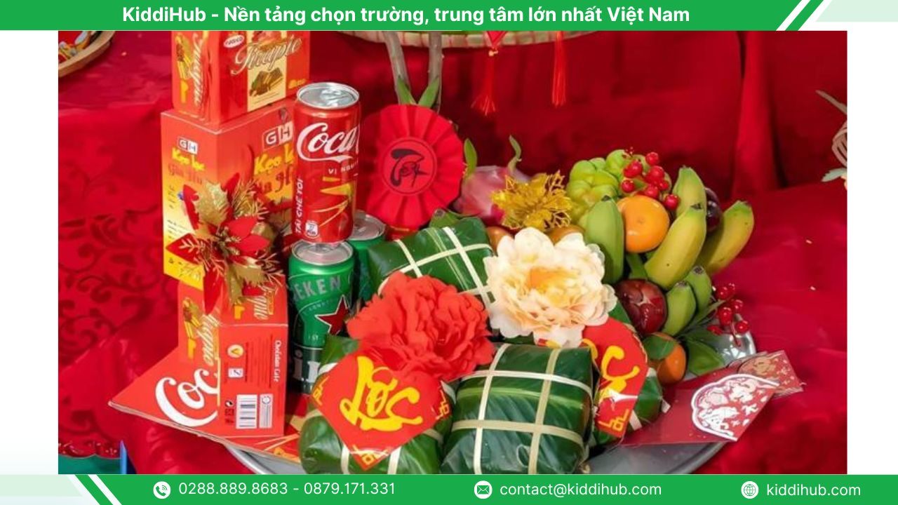 Hoa tươi, đèn lồng, bao lì xì hay những vật phẩm tượng trưng cho may mắn và tài lộc là những món đồ không thể thiếu. Chúng không chỉ làm mâm bánh thêm sinh động mà còn tăng thêm giá trị ý nghĩa, thể hiện lòng tôn kính tổ tiên và gửi gắm hy vọng về một năm mới bình an.