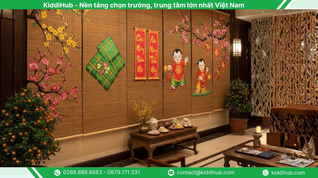 Những chiếc mẹt tre được decor khéo léo với câu chúc năm mới tài lộc, hoa mai, hoa đào rực rỡ hay các họa tiết xuân truyền thống sẽ tạo nên điểm nhấn sinh động cho bức tường. Bên cạnh đó, hình ảnh bánh chưng, bánh tét, dưa hấu đỏ lòng hoặc các loại hoa quả quen thuộc của ngày Tết cũng thường được đưa vào, mang ý nghĩa cầu mong may mắn, sung túc và đủ đầy cho năm mới.