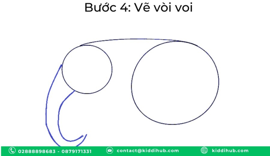 Từ phần đầu (hình tròn nhỏ), vẽ hai đường cong chạy song song và chụm lại ở đầu – đó chính là chiếc vòi nổi bật của voi.