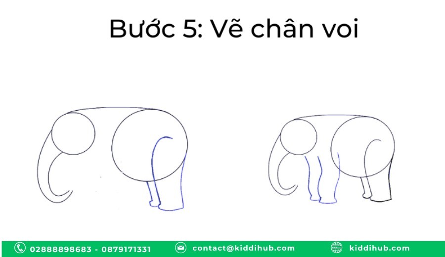 Bốn chiếc chân của voi con ngắn nhưng vững chắc. Bé hãy phác thảo bốn hình trụ dày dặn để tạo đôi chân khỏe mạnh. Phần trên chân hơi to và thu nhỏ dần về phía móng. Để tăng độ chân thực, có thể vẽ thêm các đường nếp gấp nhỏ vì da voi có độ nhăn tự nhiên. Cuối mỗi chân, vẽ ba hoặc bốn chiếc móng nhỏ hình bán nguyệt giúp đôi chân voi thêm chắc chắn.