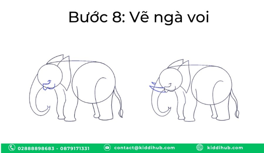 Từ phần dưới đầu voi, vẽ hai chiếc ngà cong hướng xuống – một đặc điểm không thể thiếu.