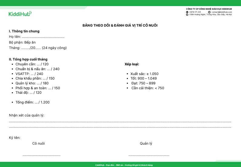 Chuẩn hóa công tác đánh giá bảo mẫu, cô nuôi không chỉ giúp nhà trường kiểm soát chất lượng chăm sóc trẻ mỗi ngày, mà còn hoàn thiện bức tranh tổng thể về đánh giá cán bộ và quản trị đội ngũ theo hướng bài bản, minh bạch.