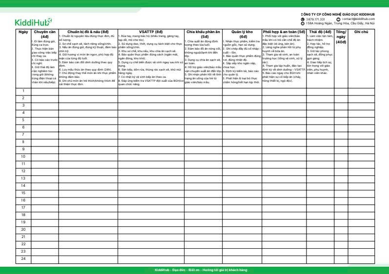 Với cô nuôi, trọng tâm là an toàn thực phẩm và quy trình bếp – khu vực rủi ro cao nhưng dễ bị bỏ qua.