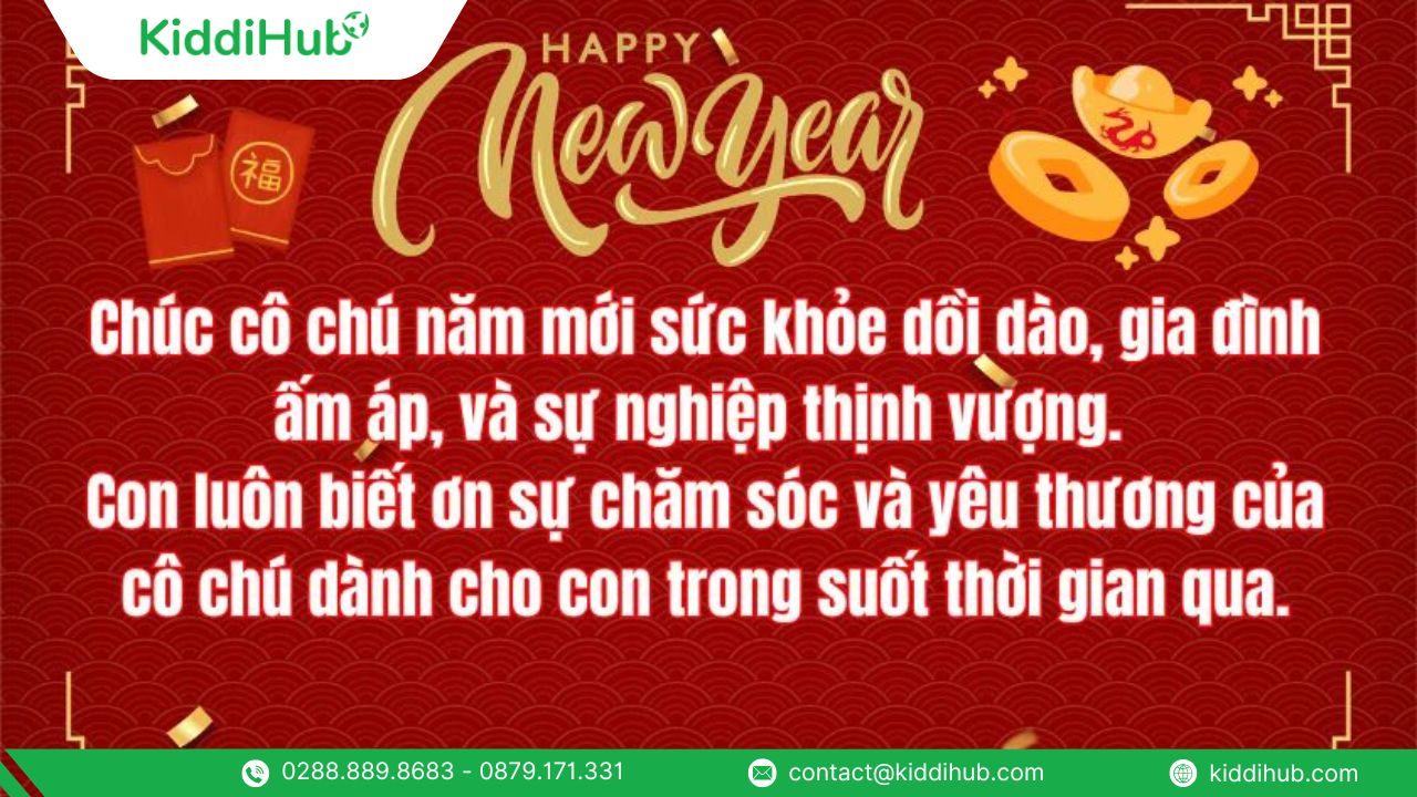 Con xin gửi tới cô chú lời chúc năm mới an khang, thịnh vượng, tràn đầy niềm vui. Cảm ơn cô chú luôn dành tình thương và sự quan tâm cho con. Chúc gia đình mình luôn mạnh khỏe và hạnh phúc.
