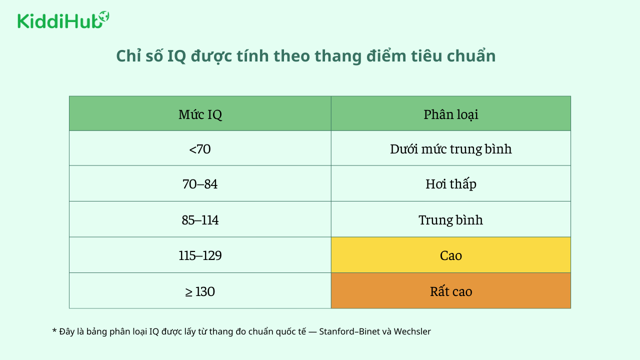 Theo phổ điểm IQ chuẩn (trung bình = 100), trẻ có IQ từ 115 trở lên được xem là có khả năng tư duy và học tập tốt; IQ khoảng 130 hoặc hơn thường thuộc nhóm năng khiếu đặc biệt, với tư duy logic – sáng tạo – ngôn ngữ vượt trội.