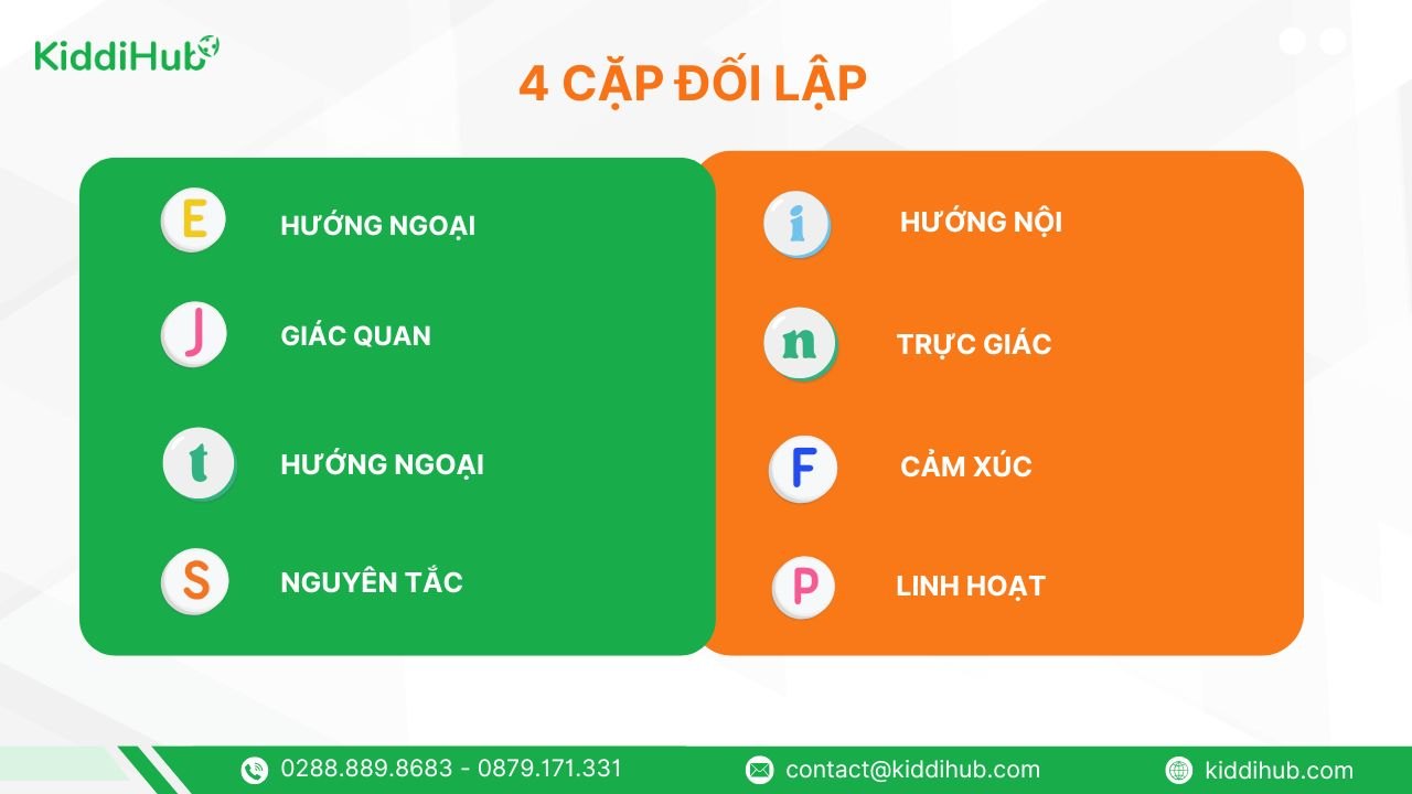 MBTI đầy đủ có 16 nhóm tính cách, nhưng để bố mẹ dễ hình dung nhất, có thể bắt đầu từ 4 cặp khuynh hướng cơ bản. Mỗi cặp đều thể hiện rất rõ trong hành vi hằng ngày của trẻ.