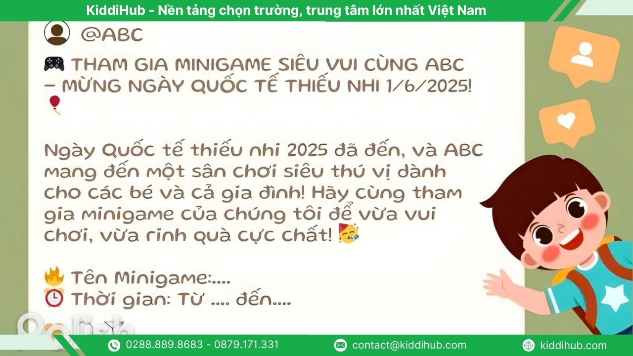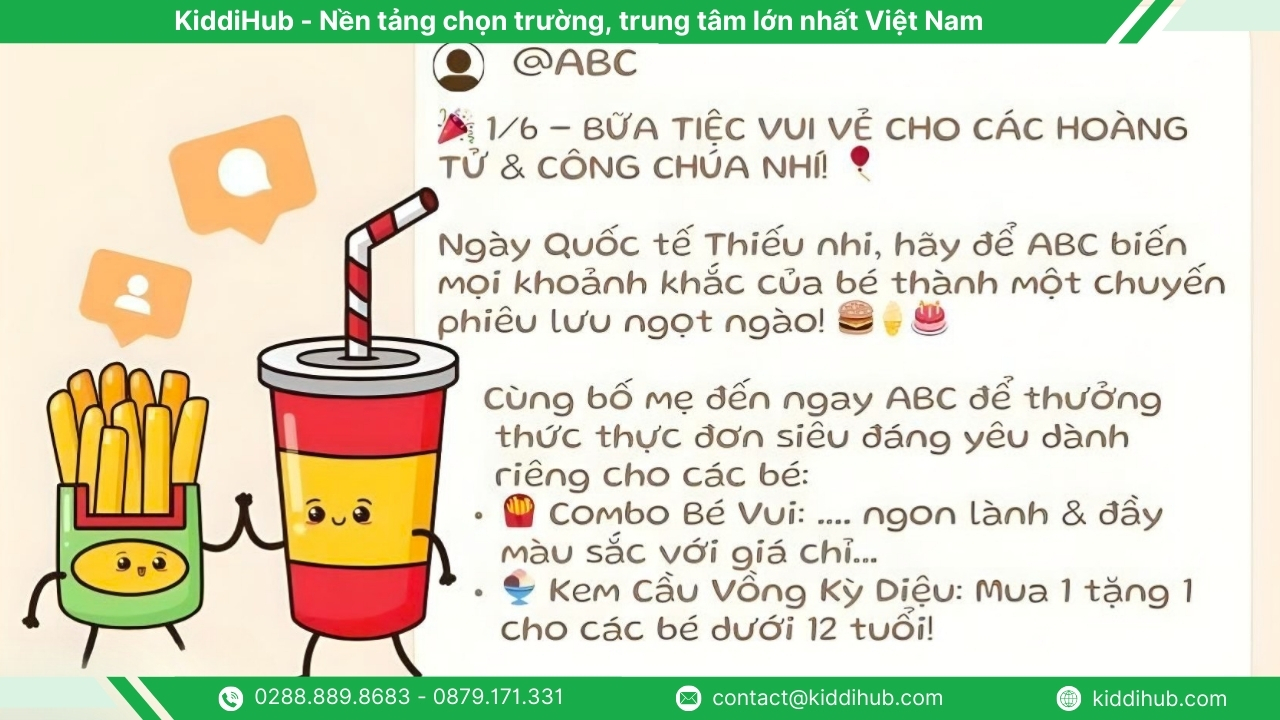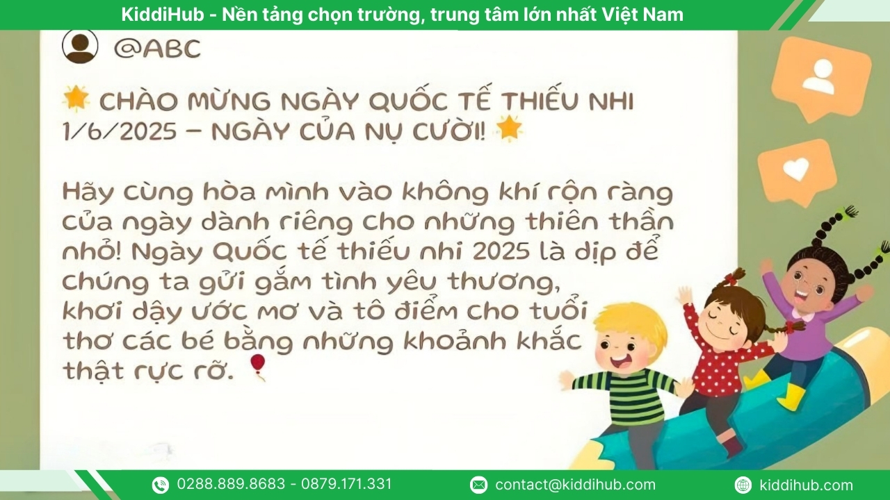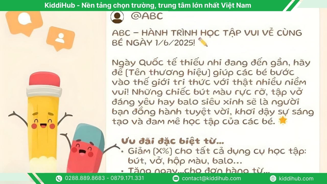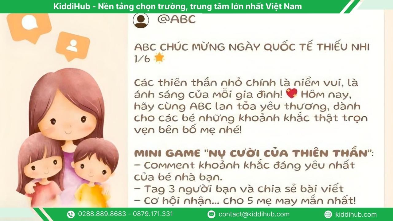 Ngày Quốc tế Thiếu nhi 1/6 năm 2026 là dịp để các thương hiệu, trường học và trung tâm giáo dục thể hiện sự quan tâm dành cho trẻ nhỏ thông qua những nội dung truyền thông hấp dẫn. Việc xây dựng content tết thiếu nhi, lựa chọn mẫu content quốc tế thiếu nhi phù hợp và phát triển ý tưởng content quốc tế thiếu nhi sáng tạo sẽ giúp chiến dịch trở nên nổi bật, thu hút và ghi dấu ấn trong lòng phụ huynh.