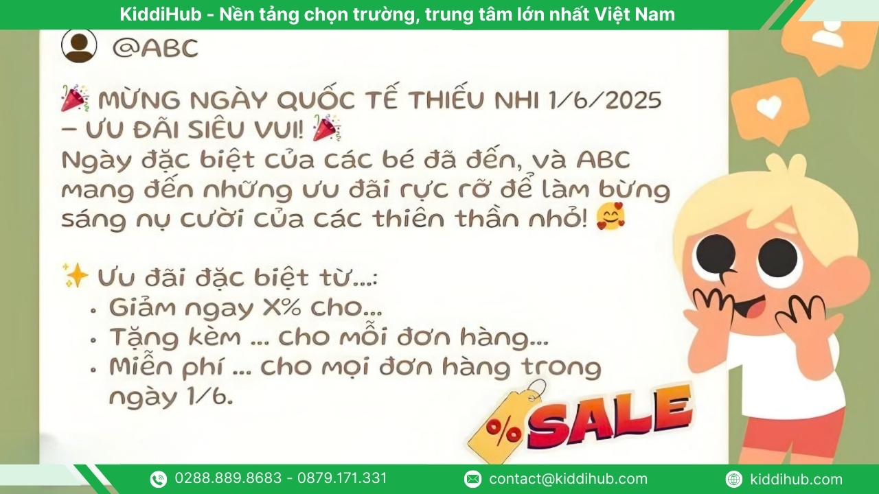 Bên cạnh những mẫu content ngày Quốc tế Thiếu nhi đã chia sẻ, doanh nghiệp cũng có thể triển khai thêm nhiều hình thức khuyến mãi sáng tạo để tăng sức hút và khả năng tiếp cận khách hàng. Dưới đây là một số ý tưởng nổi bật: