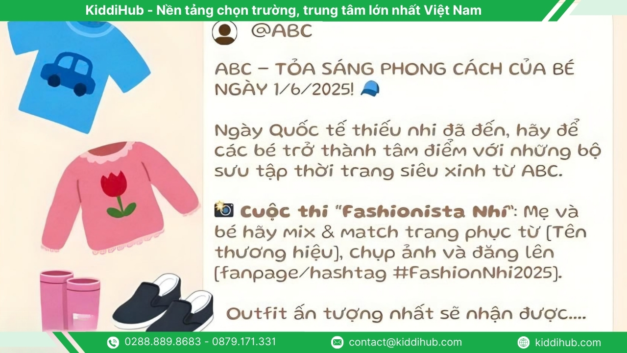 Phụ huynh cùng bé phối đồ từ [Tên thương hiệu], chụp ảnh và đăng tải lên [fanpage/hashtag #FashionNhi2026]. Bài dự thi nổi bật nhất sẽ nhận [giải thưởng].