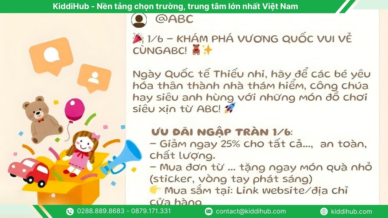 Mỗi mùa Quốc tế Thiếu nhi, việc xây dựng nội dung truyền thông sáng tạo luôn là yếu tố quan trọng giúp chương trình khuyến mãi thu hút khách hàng. Với content tết thiếu nhi được đầu tư bài bản, kết hợp linh hoạt các mẫu content quốc tế thiếu nhi và ý tưởng content quốc tế thiếu nhi mới mẻ, doanh nghiệp sẽ dễ dàng tạo dấu ấn riêng trong dịp 1/6. Cùng khám phá những gợi ý hữu ích ngay sau đây.