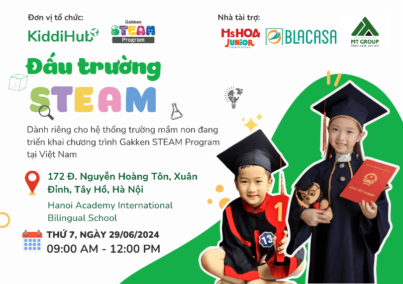 Nghỉ hè, các bé mầm non làm gì? Tạm gác học tập để về quê hay ở nhà chơi đợi đến ngày đi học trở lại? Với mong muốn tạo ra những kỉ niệm mùa hè 2024 đáng nhớ mà các bé mầm non hoàn toàn có thể sử dụng kiến thức đã học, KiddiHub cùng nhà tài trợ: Hệ thống đào tạo tiếng Anh trẻ em Ms Hoa Junior, Hệ thống trung tâm đào tạo năng khiếu MT Group, Trung tâm học Toán Tiếng Anh chuẩn Cambridge Blacasa tổ chức chương trình “Đấu trường STEAM” khu vực phía Bắc