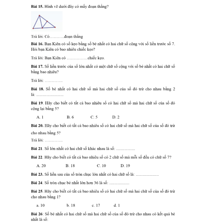 Bài 7: Lan có số viên kẹo bằng số lớn nhất gồm hai chữ số giống nhau. Huy có ít hơn Lan 18 viên kẹo. Hỏi tổng số kẹo của hai bạn là bao nhiêu?