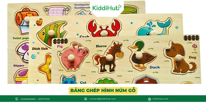 Sản phẩm ghép hình núm gỗ có các mảnh ghép được thiết kế khớp với vị trí trên bảng, giúp trẻ nhận diện các chữ cái, con số và hình ảnh.