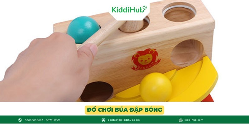 Cách chơi: Trẻ dùng búa gõ vào bóng để làm bóng rơi xuống và lăn ra ngoài.