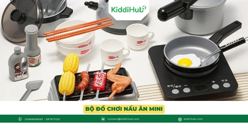 Bộ sản phẩm bao gồm các dụng cụ nhà bếp và thực phẩm mô phỏng, giúp trẻ nhập vai và khám phá thế giới bếp núc.