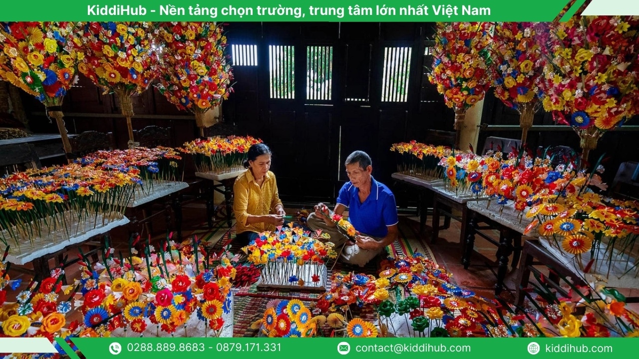 Hoa giấy Thanh Tiên xuất phát từ tín ngưỡng thờ cúng của người Huế, thường được trang trí trong các không gian linh thiêng vào đầu năm. Khi du lịch Huế Tết Tây, đến làng, bạn sẽ bắt gặp hình ảnh các nghệ nhân khéo léo uốn tre, cắt giấy, pha màu để tạo nên những bông hoa sống động. Không khí rộn ràng, mùi tre và giấy mới hòa quyện cùng sắc màu rực rỡ của hoa giấy tạo nên trải nghiệm ấm áp cho kỳ nghỉ..