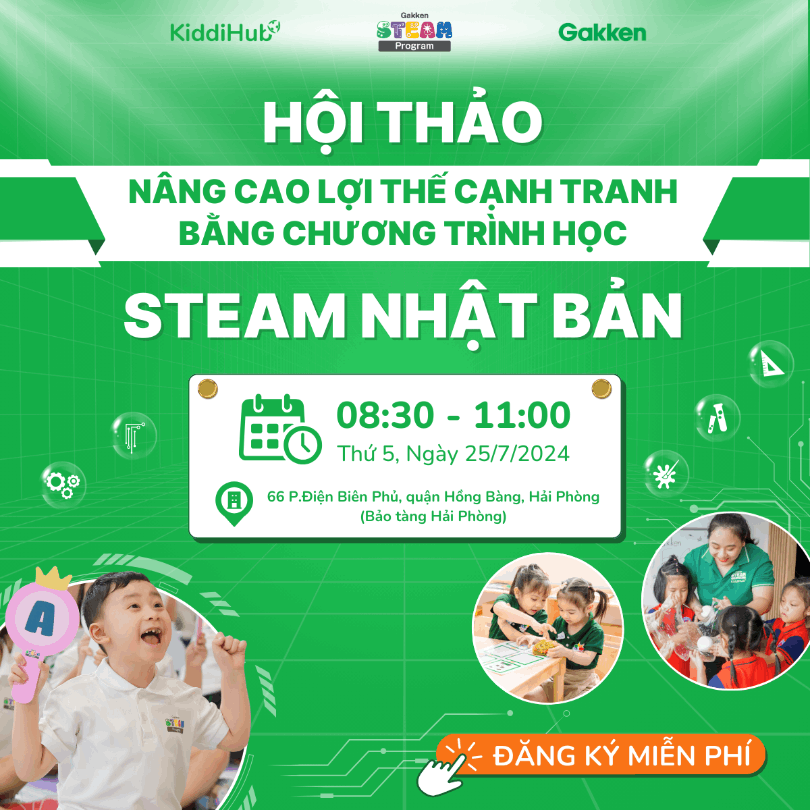 KiddiHub trân trọng thông báo tổ chức hội thảo chuyên đề "Nâng cao lợi thế cạnh tranh bằng STEAM Nhật Bản". Hội thảo này được thiết kế đặc biệt dành cho các chủ trường mầm non tại Hải Phòng và khu vực lân cận nhằm giới thiệu và hướng dẫn áp dụng chương trình giáo dục tiên tiến Gakken STEAM tiêu chuẩn Nhật Bản.