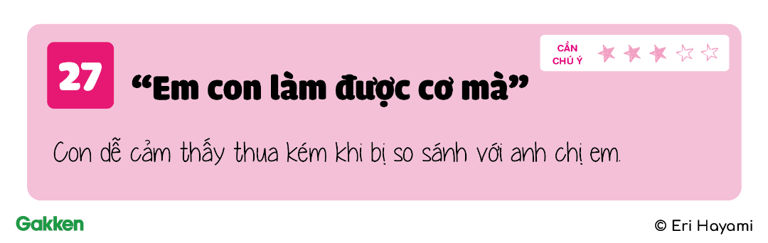 So sánh các anh chị em trong nhà với nhau không đem lại kết quả tốt nào hết. Khi bố mẹ quy chụp các con thành "ngoan" "hư" "xuất sắc" "tầm thường", thì đứa bị chê sẽ thấy thất vọng, đứa được khen sẽ khinh thường những trẻ khác. Khi lớn lên, có thể con sẽ không ở bên bạn bè nữa; nhưng nếu là anh chị em thì vòng luẩn quẩn đó sẽ cứ mãi tiếp diễn. Như vậy, đứa con mà bạn chê là thua kém sẽ không thể nào có được sự tự tin. Kể cả đứa luôn được khen cũng vậy, nếu không được so sánh với người khác thì sự tự tin của chúng cũng sẽ rất bấp bênh. Chúng ta đều muốn nuôi dạy những đứa con mình thật tốt mà không cần phải so sánh nó với nhau đúng không? | ![]() |