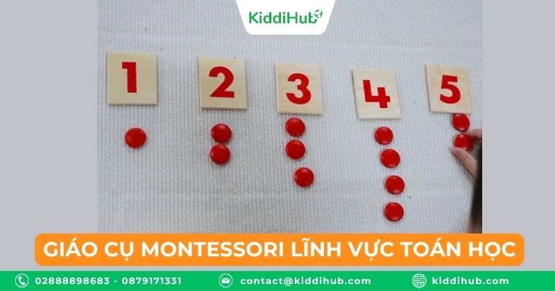 Khu vực Toán học trong lớp học Montessori đặc trưng bởi các giáo cụ thực hành cụ thể, giúp trẻ nhận diện các con số và mối quan hệ giữa chúng. Những giáo cụ này giúp trẻ chuyển từ các ký hiệu số trừu tượng sang số lượng cụ thể và dễ hiểu.