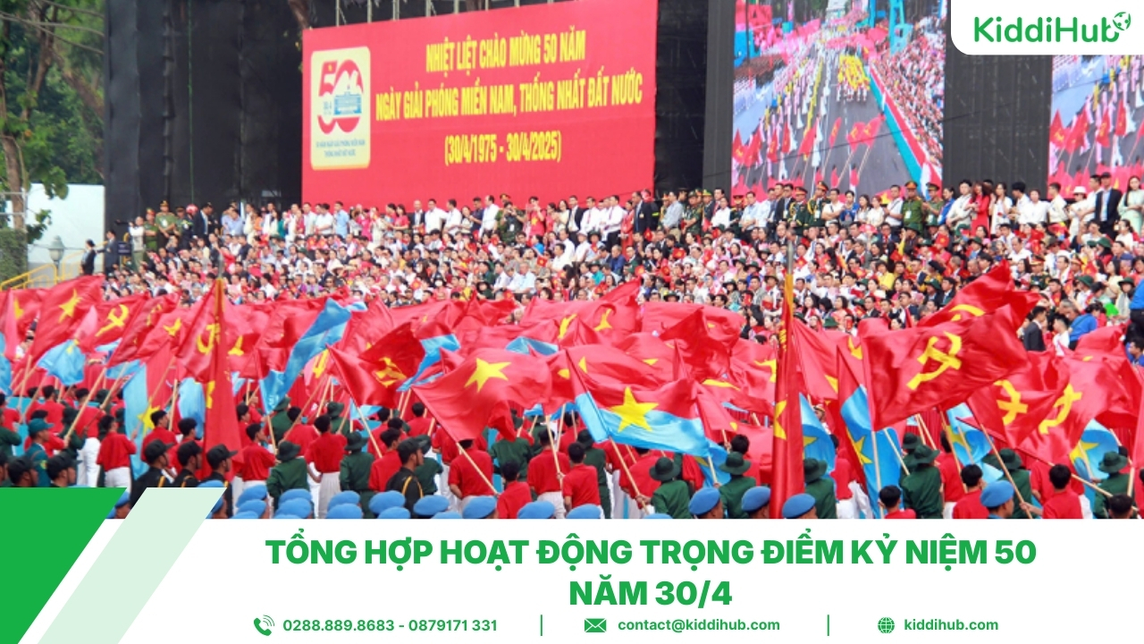 Hoạt động chào mừng 30 4 được tổ chức sôi nổi và trang trọng trên khắp cả nước, mang ý nghĩa tôn vinh giá trị lịch sử của ngày đất nước thống nhất, đồng thời khơi dậy tinh thần yêu nước và niềm tự hào dân tộc trong mỗi người dân. Không chỉ là dịp ôn lại truyền thống hào hùng, các chương trình còn góp phần gắn kết cộng đồng và lan tỏa những thông điệp tích cực, trong bài viết này Kiddihub sẽ cùng bạn điểm qua những hoạt động tiêu biểu và ý nghĩa nhất.