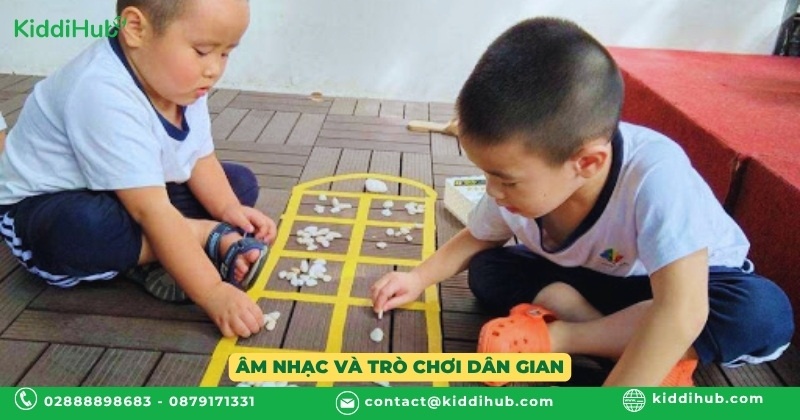 Các hoạt động âm nhạc kết hợp trò chơi dân gian truyền thống được tổ chức nhằm phát triển cảm nhận về âm nhạc, nhịp điệu và kỹ năng vận động tinh tế cho trẻ. Trẻ sẽ được hát các bài hát mùa hè vui tươi, tham gia trò chơi như nhảy dây, ô ăn quan, bịt mắt bắt dê – những trò chơi không chỉ mang lại niềm vui mà còn tăng cường sự phối hợp cơ thể, khả năng nghe hiểu và kỹ năng giao tiếp xã hội.
