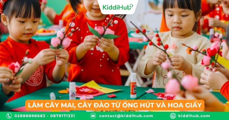 Một hoạt động thú vị và sáng tạo dành cho trẻ mầm non trong dịp Tết là làm cây mai hoặc cây đào thủ công từ ống hút và hoa giấy. Đây là cách tái hiện hình ảnh mùa xuân sinh động bằng những nguyên vật liệu thân thiện, dễ tìm và an toàn cho trẻ.