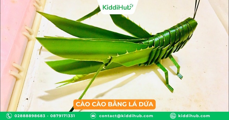 Bước 2: Uốn phần gân ra phía trước, rồi lần lượt luồn từng phần lá qua để đan thân cào cào.