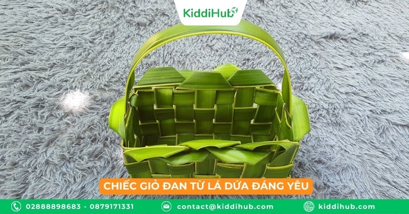 Cắt 12 đoạn lá dứa thành hình chữ nhật bằng nhau. Trải 6 chiếc theo chiều dọc rồi đan 6 chiếc còn lại theo chiều ngang, so le tạo thành một mặt vuông như tấm thảm. Tiếp tục gấp phần thừa từ các lá trung tâm theo hình chữ V, dựng các cạnh lên và đan phần còn lại để tạo thành thành giỏ. Dùng ghim cố định các mép để giỏ cứng cáp hơn. Khi đã hoàn thiện hình khối, bạn luồn phần lá thừa vào các khe hoặc cắt ngắn tùy ý. Chiếc giỏ nhỏ xinh này không chỉ là đồ chơi mà còn là vật đựng đồ thủ công lý tưởng cho bé.