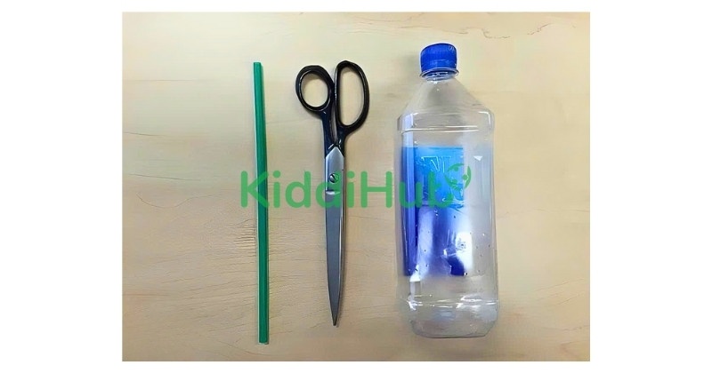 Bước 1: Chuẩn bị đầy đủ vật liệu gồm kéo, ống hút nhựa và một chai nhựa hình vuông.