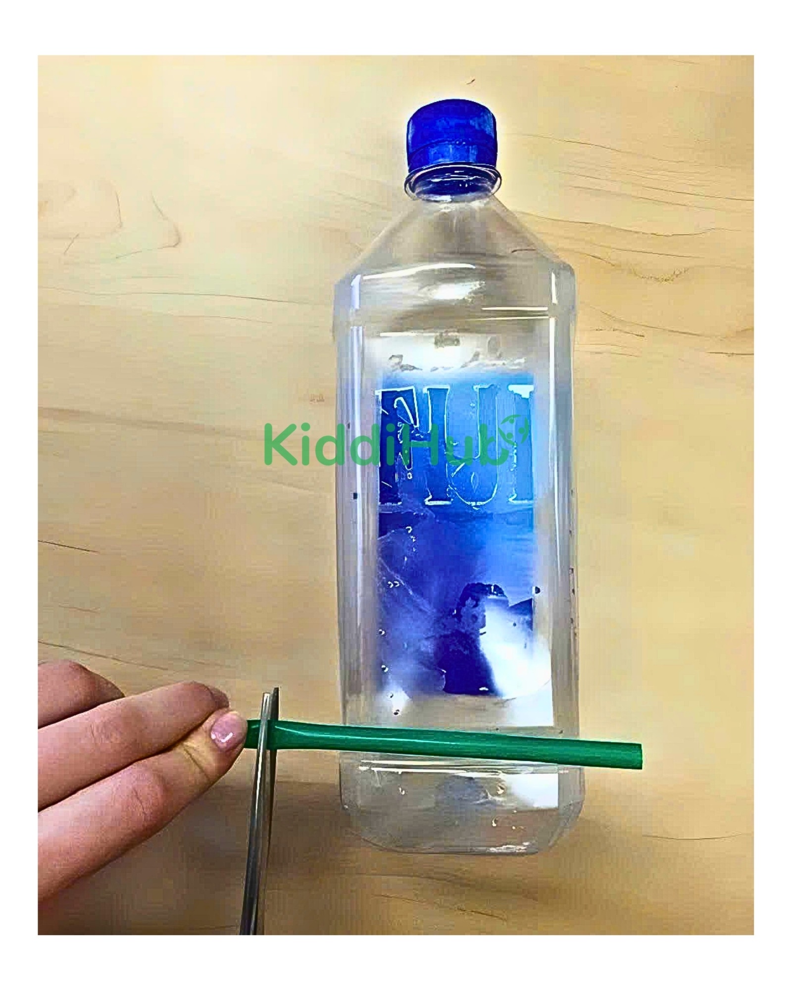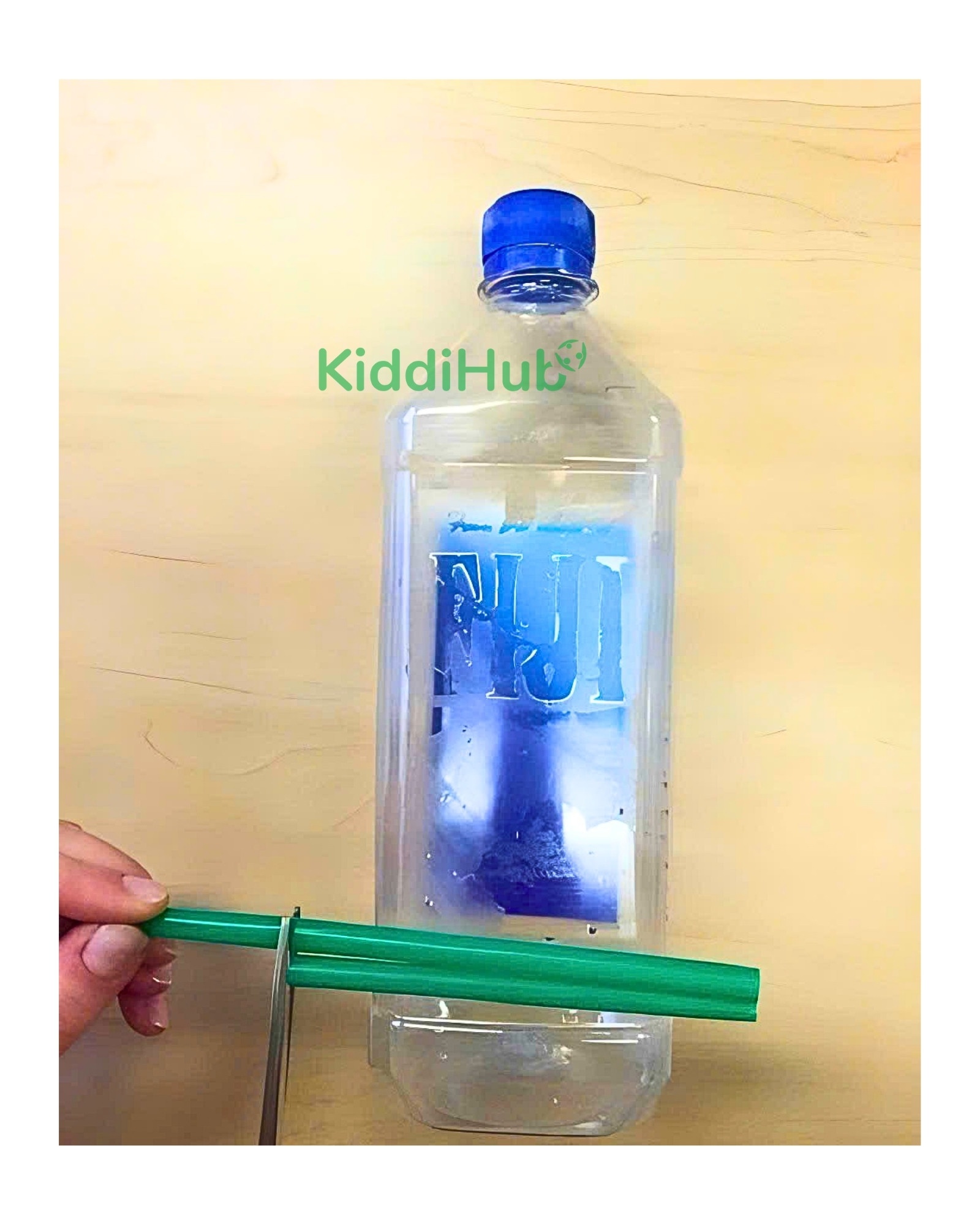 Bước 2: Gắn ống hút lên thân chai, cắt sao cho mỗi đầu ống hút nhô ra khoảng 2,5cm.