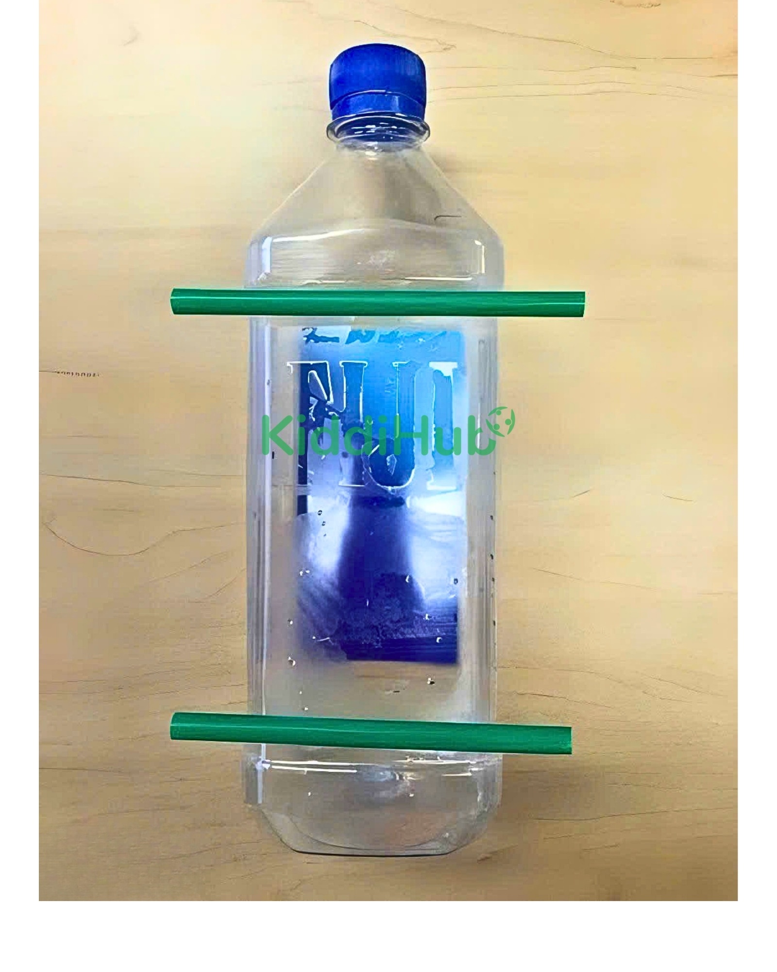 Bước 4: Gắn hai đoạn ống hút lên thân chai, đặt chúng càng cách xa nhau càng tốt và đảm bảo vuông góc với trục chai.