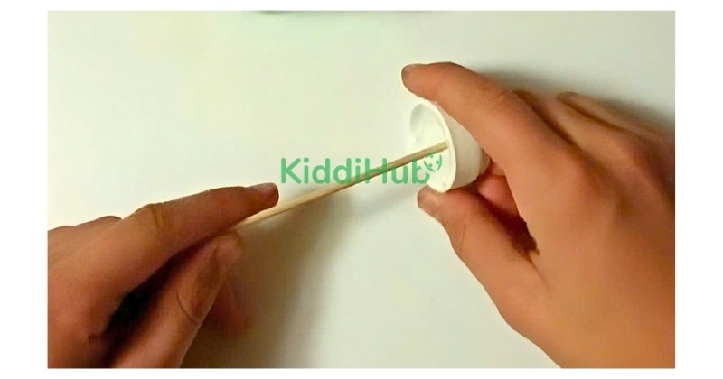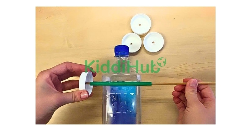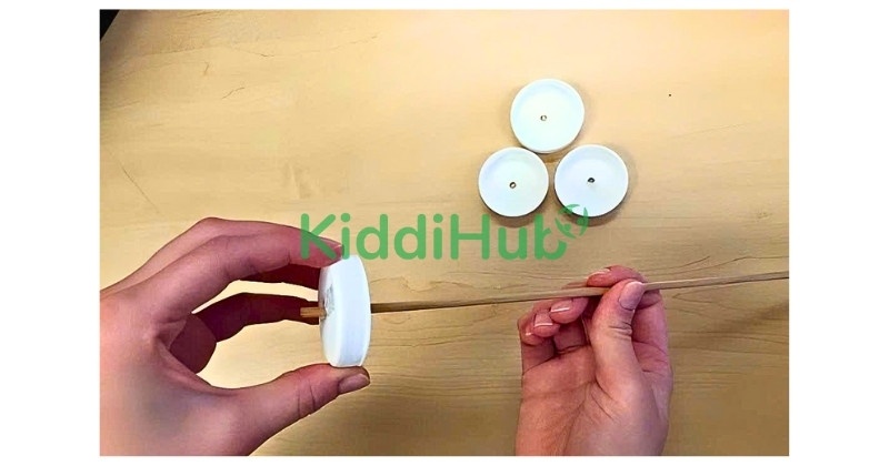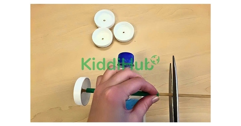 Bước 5: Xuyên thanh xiên gỗ qua nắp chai sao cho mỗi đầu nhô ra khoảng 0,5 cm để làm trục bánh xe.