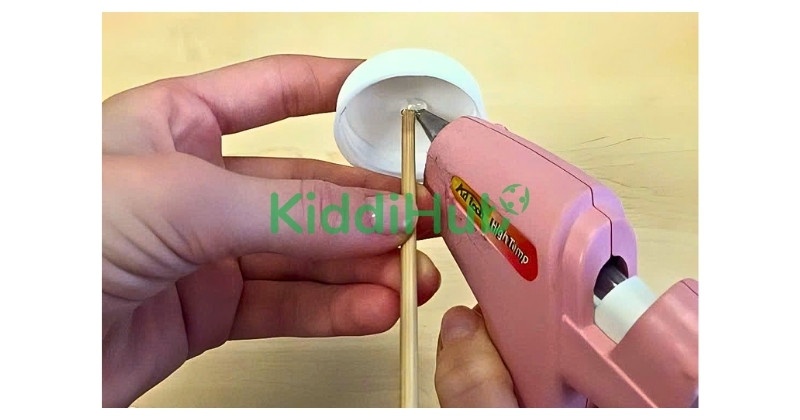 Bước 6: Sử dụng keo nóng để gắn chắc nắp chai vào đầu thanh xiên, ở mặt trong của nắp.