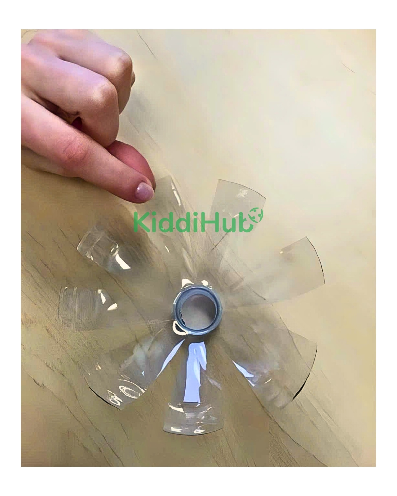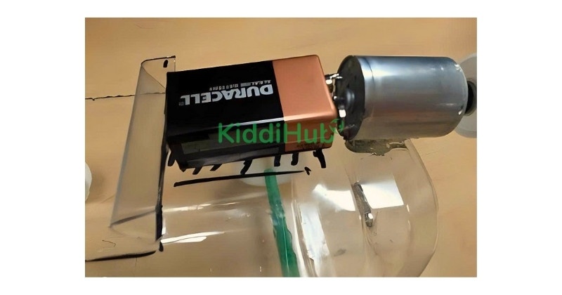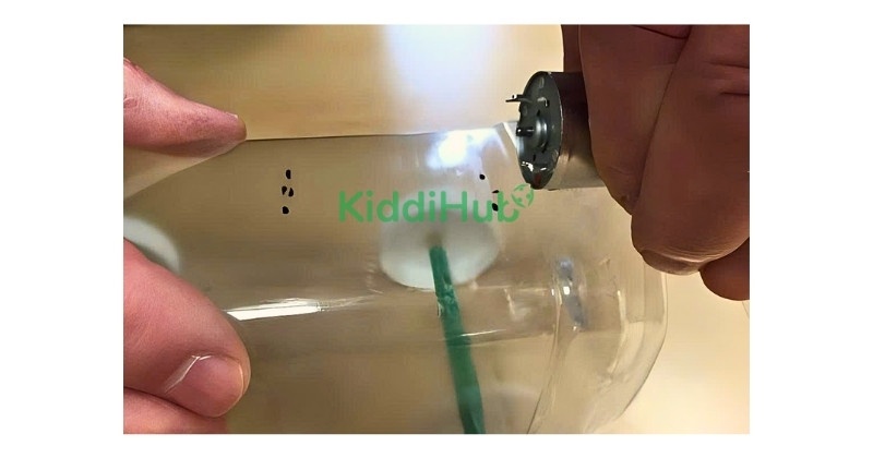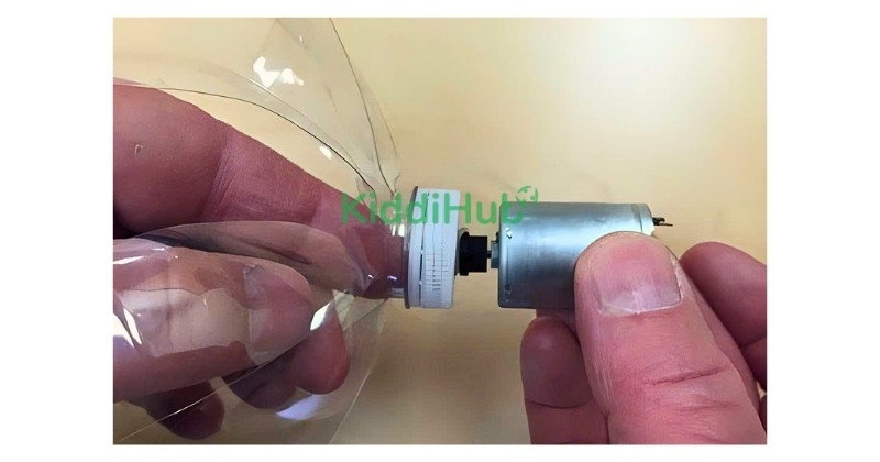 Bước 24: Gắn mô-tơ lên chính giữa phần trên cùng của chai nhựa, tham khảo hình minh họa để xác định đúng vị trí.