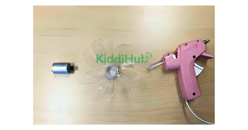 Bước 19: Chuẩn bị động cơ, bộ cánh quạt đã làm và súng bắn keo để lắp ráp.