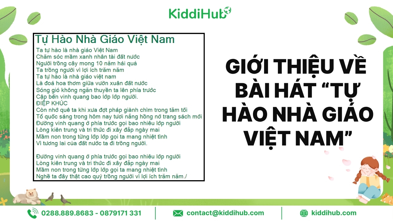 Trên đây, KiddiHub đã trình bày lời bài hát Tự hào Nhà giáo Việt Nam. Qua lời bài hát Tự hào Nhà giáo Việt Nam, ta cảm nhận được tình yêu, sự kính trọng và lòng biết ơn sâu sắc dành cho những người lái đò thầm lặng. giai điệu ấy như một món quà tri ân, nhắc nhở mỗi chúng ta luôn trân quý công lao to lớn của thầy cô.