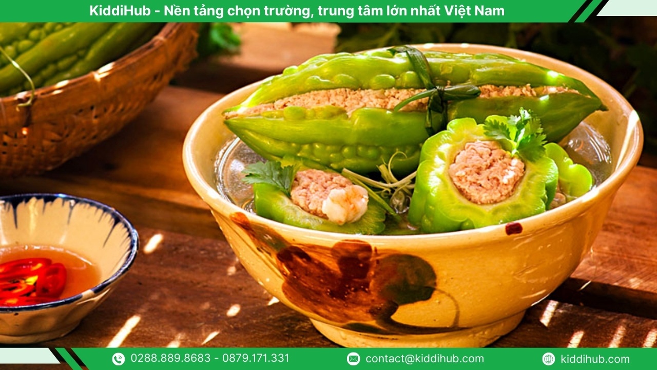 Khổ qua được chọn tươi xanh, cạo bỏ ruột và nhồi phần thịt xay đã ướp gia vị thơm ngon bên trong. Sau đó, món ăn được ninh trong nước hầm xương cùng một ít rau mùi, tạo hương vị hấp dẫn, đậm đà. Khi thưởng thức, vị đắng nhẹ của khổ qua hòa quyện cùng vị ngọt béo của thịt, không chỉ kích thích vị giác mà còn giúp giải nhiệt, giảm ngán khi ăn nhiều món béo, ngọt trong dịp Tết.