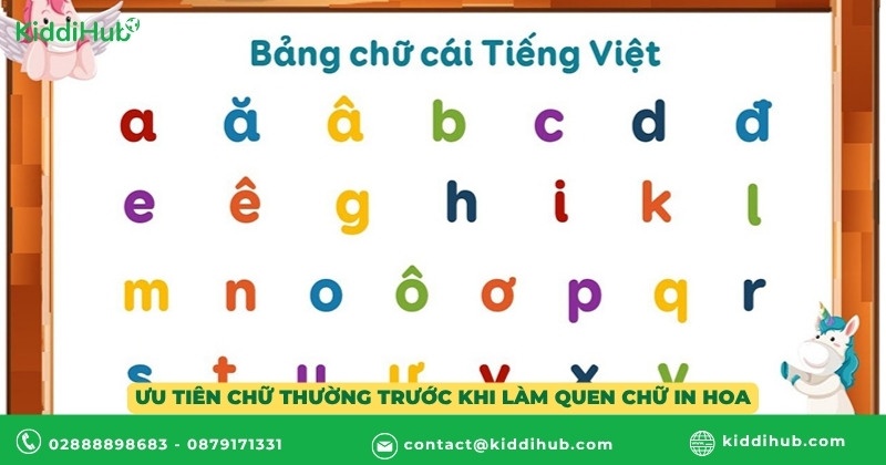 Khi bắt đầu dạy chữ cho bé 4 tuổi, ba mẹ nên hướng dẫn bé làm quen với chữ thường trước. Đây là kiểu chữ xuất hiện phổ biến trong sách, truyện, biển hiệu và các tài liệu học tập ở trường mầm non, giúp trẻ dễ nhận biết và ghi nhớ hơn. Sau khi bé đã quen với mặt chữ thường, việc chuyển sang chữ in hoa sẽ trở nên nhẹ nhàng, không gây rối loạn hoặc nhầm lẫn.