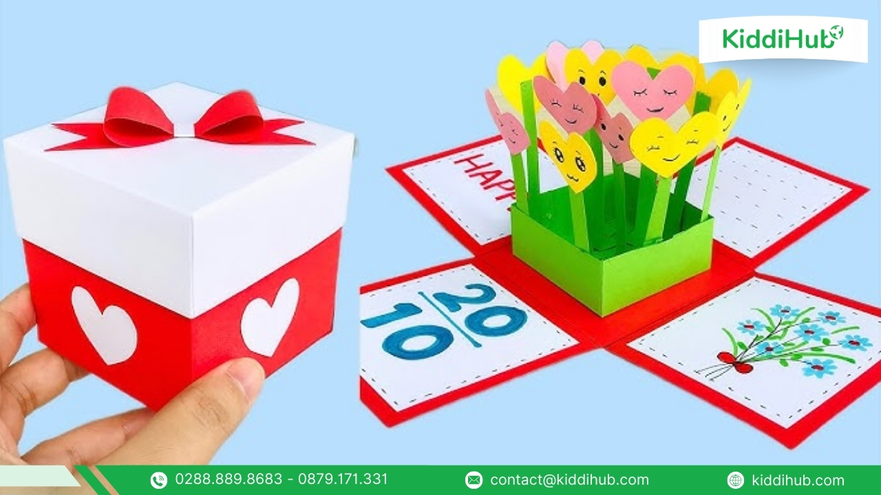 Một tấm thiệp handmade với hình vẽ đơn giản như hoa, trái tim, cầu vồng hay nhân vật hoạt hình bé yêu thích là lựa chọn dễ thực hiện nhất. Ba mẹ có thể dùng bút màu, sticker hoặc giấy màu để trang trí, kèm theo vài lời chúc ngắn gọn, đáng yêu. Bé có thể cất giữ thiệp trong góc học tập hoặc hộp kỷ niệm như một món quà tinh thần lâu dài.