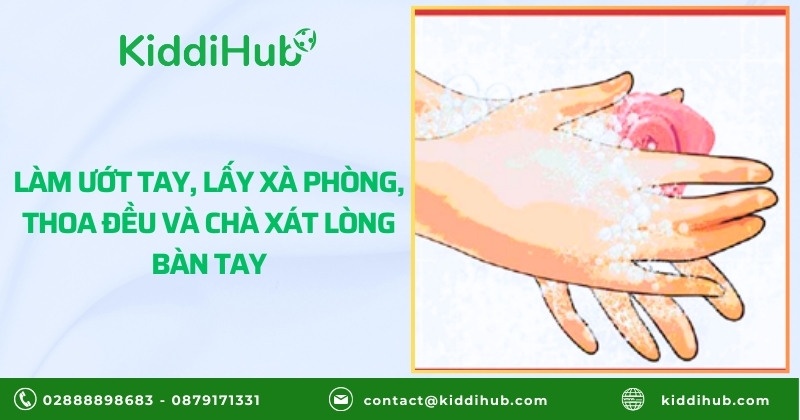 Bước 1: Làm ướt hai tay bằng nước sạch, lấy lượng xà phòng vừa đủ, thoa đều và chà xát hai lòng bàn tay với nhau.