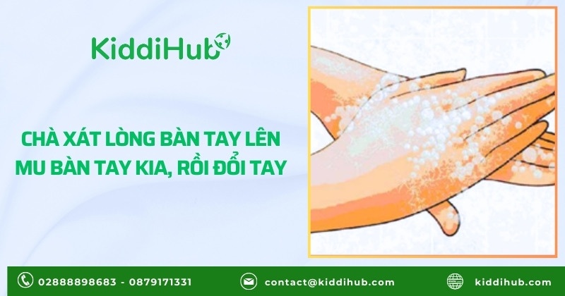 Bước 3: Áp lòng bàn tay này lên mu bàn tay kia, chà xát theo chiều ngang rồi đổi tay thực hiện tương tự.